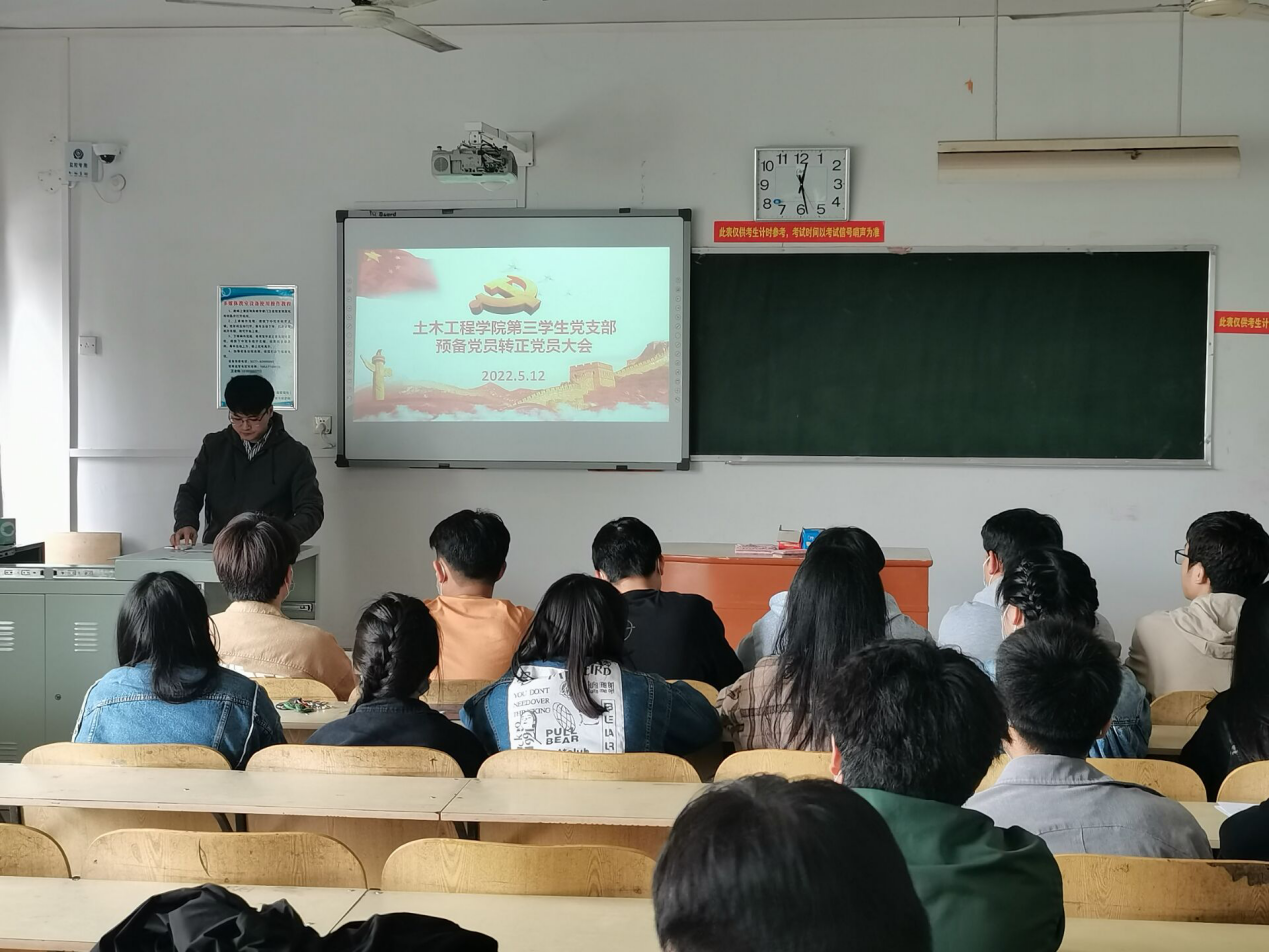 2022年5月12日,土木工程学院第三学生党支部于5号教学楼425教室召开预备党员转正大会。第三学生党支部书记陈哲主持本次会议,党支部全体党员参加本次活动。