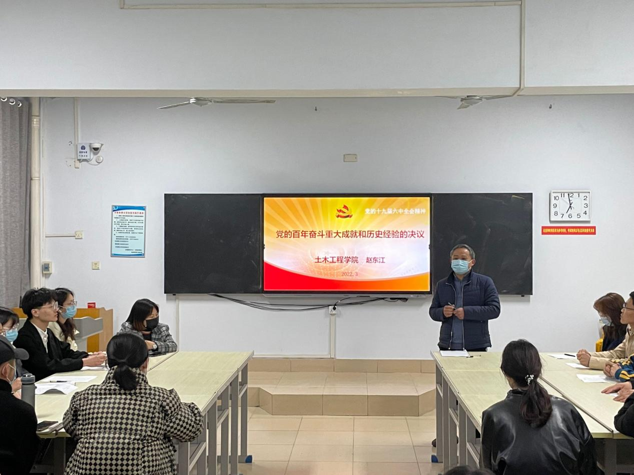 本网讯(特约记者/孙恰)3月23日,土木工程学院党委书记赵东江同志为其联系土木工程学院第一学生党支部讲授“开学思政第一课”,宣讲了党的十九届六中全会精神。