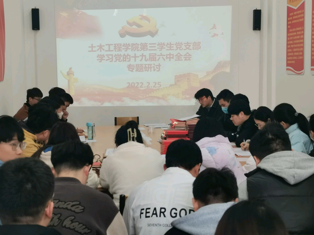 2月25日,土木工程学院第三学生党支部全体党员于5号教学楼党员活动室开展学习党的十九届六中全会专题研讨活动。