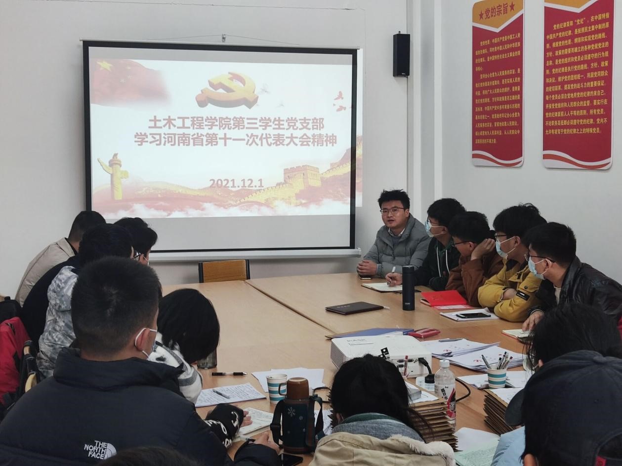 2021年12月1日,土木工程学院第三学生党支部全体党员于5号教学楼党员活动室开展学习河南省第十一次代表大会精神。