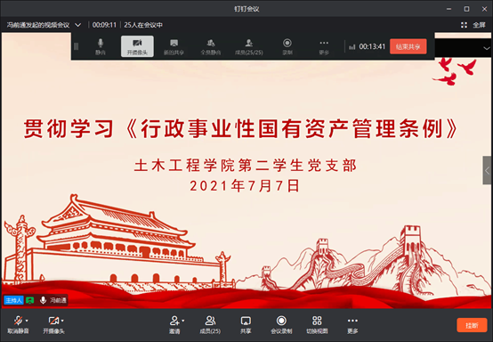 2021年7月7日晚上,土木工程学院第二学生党支部在钉钉会议开展学习主题为关于宣传贯彻《行政事业性国有资产管理条例》的活动,会议由冯前通主持,支部书记杨燕老师及第二学生支部党员参与会议。