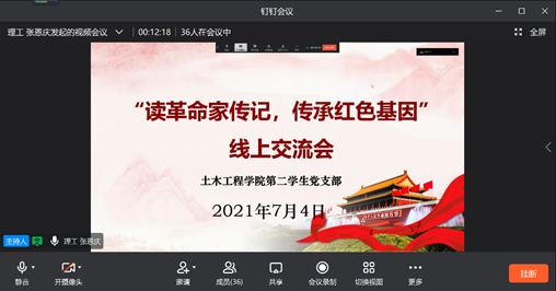 2021年7月04日晚上,土木工程学院第二学生党支部在钉钉会议开展主题为“读革命家传记 传承红色基因”线上交流会,会议由张恩庆同志主持,支部书记杨燕老师及第二学生支部全体党员参与会议。