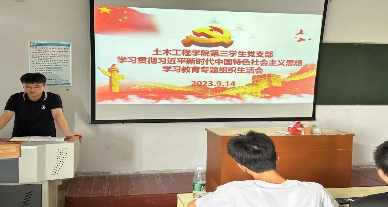 本网讯(特约记者/彭景升)9月14日下午,土木工程学院第三学生党支部于5301教室召开学习贯彻习近平新时代中国特色社会主义思想主题教育专题组织生活会,党支部书记陈哲同志主持,党支部全体党员参加。
