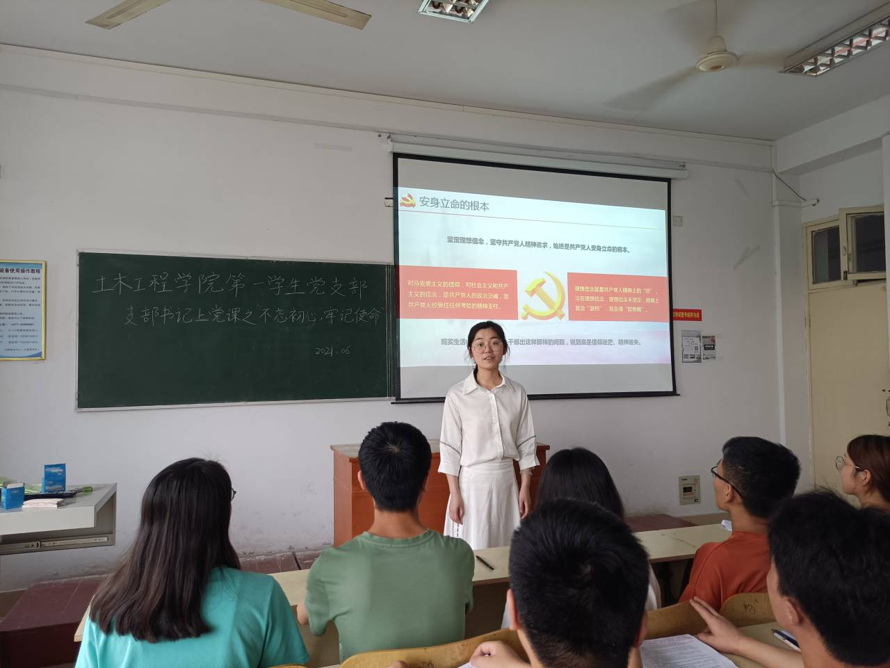 为坚定初心,强化党员同志使命感,牢记全心全意为人民服务的宗旨,土木工程学院第一学生党支部于6月17日上午10时在316教室开展了“不忘初心、牢记使命”主题教育,此次党课由第一学生党支部任寰书记为主讲人,土木工程学院第一学生党支部全体党员参与了此次党课。