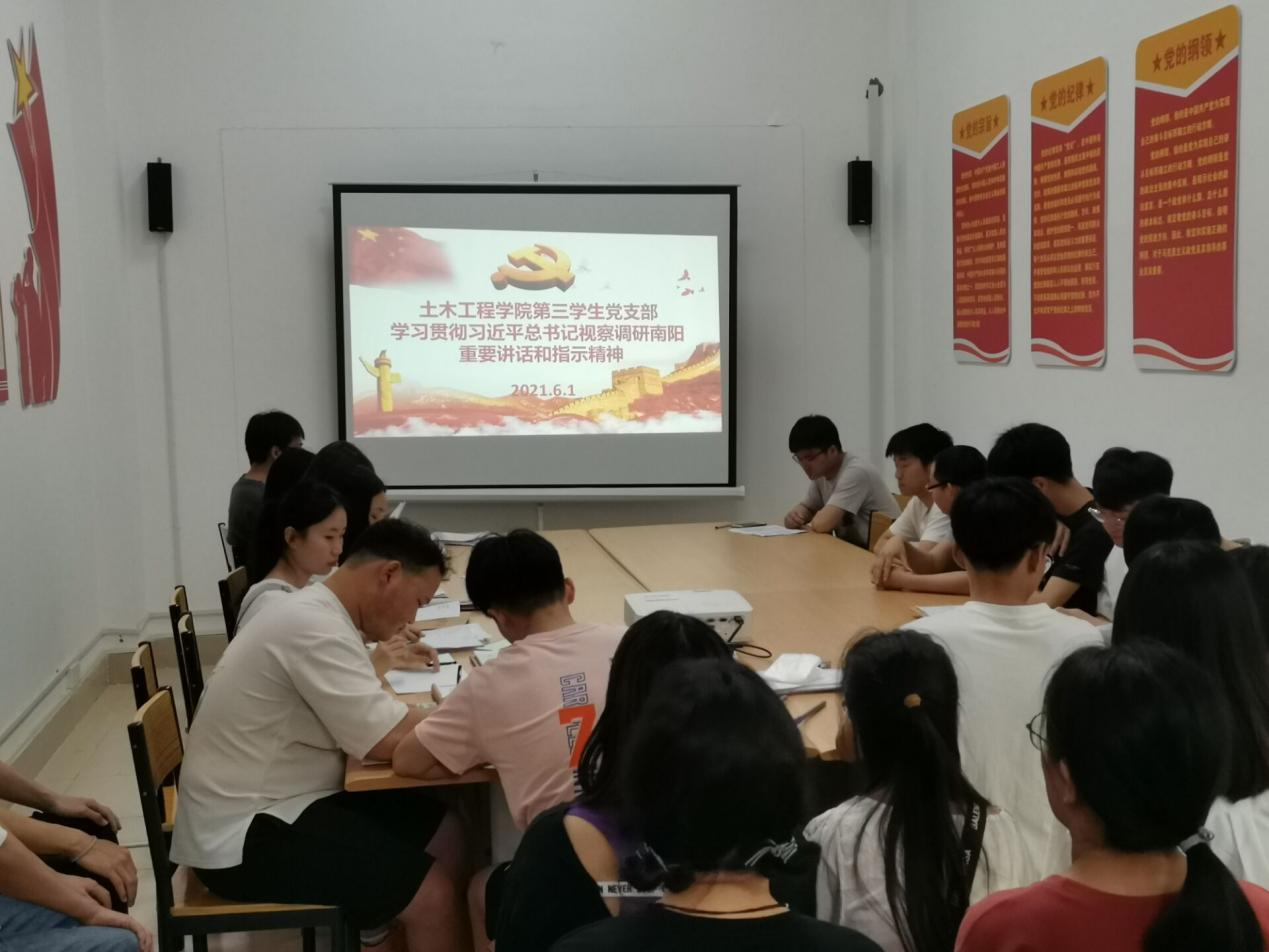 2021年6月1日下午六点,土木工程学院第三学生党支部在5号教学楼党员活动室,全体党员参加会议,集体进行深入学习习近平总书记视察调研南阳重要讲话和指示精神,本次学习由支部书记陈哲主持,本次学习习近平总书记在视察调研南阳重要讲话和指示精神,我们领会到习近平总书记对发展中医药的重视和对南阳人民的亲切关怀。习近平总书记指出中医药是中华文明瑰宝,是5000多年文明的结晶,在全民健康中应该更好发挥作用。我们学生党员也深刻认同,特别是经过抗击新冠肺炎之后,我们对中医药也有了更加深刻的认识。另外,习近平总书记还同南阳理工学院师生进行了亲切交流。我们全体学生党员倍感振奋、倍受鼓舞,立志成为能担当民族复兴大任的时代新人,不辜负习近平总书记给予的厚望。