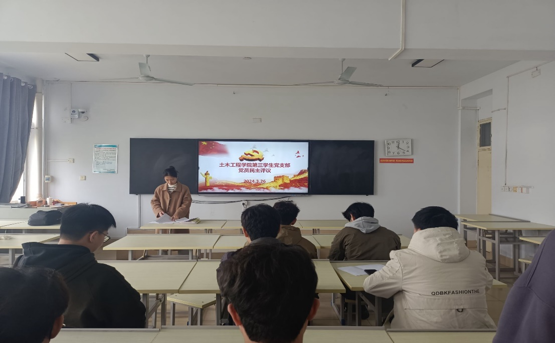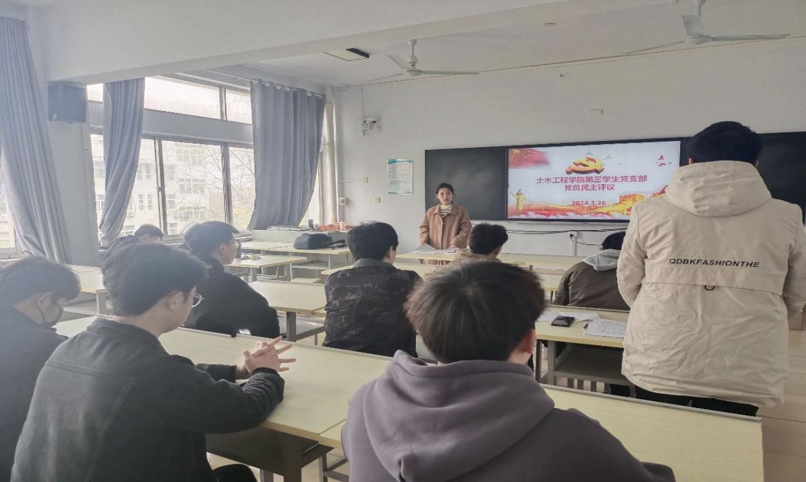本网讯(特约记者/彭景升)2024年3月26日上午,土木工程学院第三学生党支部于五号教学楼5507教室开展民主评议党员工作,李珂老师主持会议,支部全体党员参加。