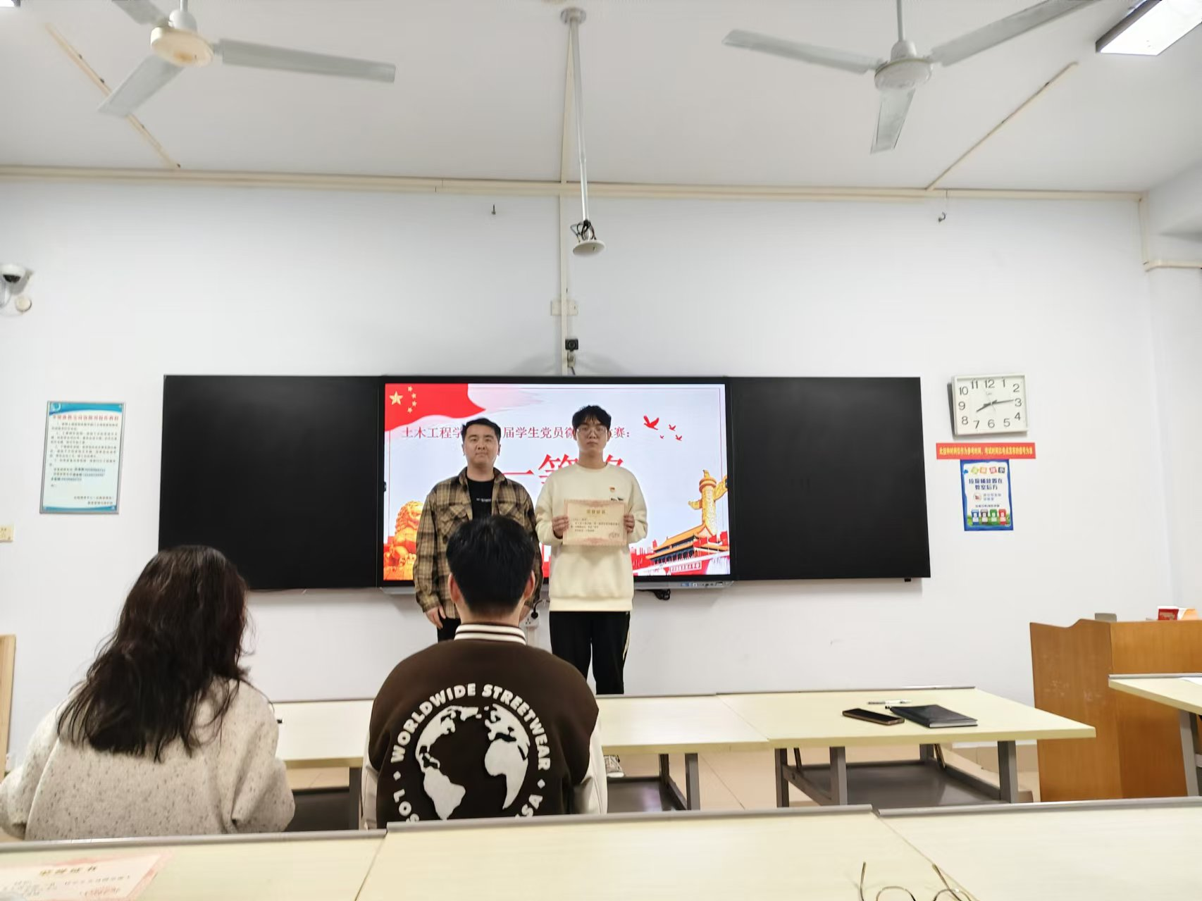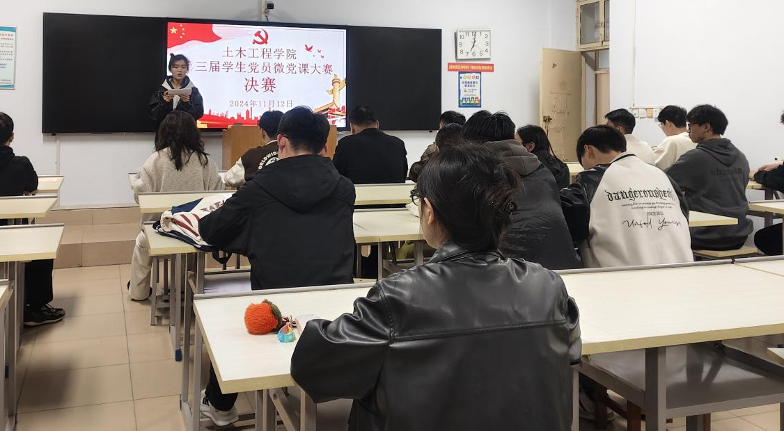 2024年11月12日晚上,土木工程学院第三届学生党员微党课大赛决赛在五号教学楼507教室举办,学院党委副书记冯博和各学生党支部书记担任评委,全体学生党员观看比赛。