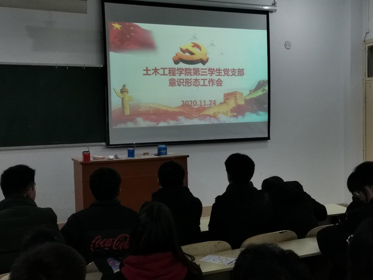 11月24日,由陈哲老师担任主讲人,在土木工程学院5509教室,举办了我院第三学生党支部2020年意识形态工作会。第三学生党支部全体党员参加了此次会议。