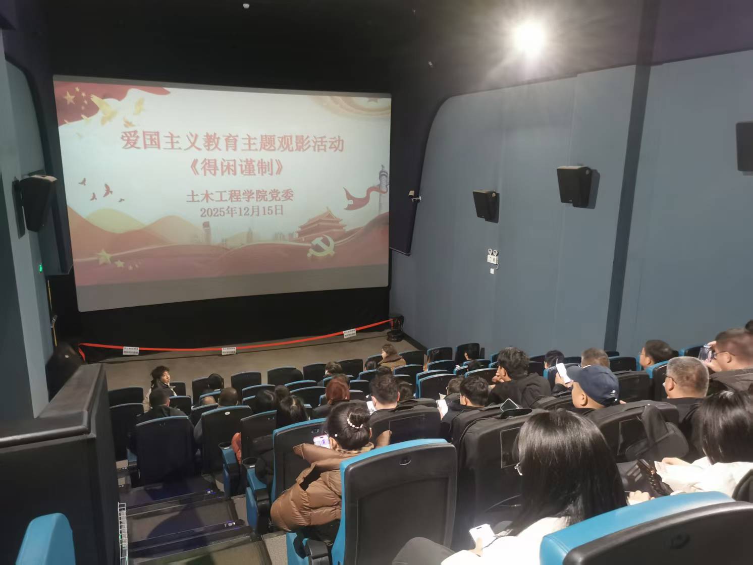 本网讯(特约记者/孙恰)为弘扬爱国主义精神,提升党性修养,强化责任担当,12月15日下午,土木工程学院党委在时代华纳巨幕影城组织开展集中观看抗日题材电影《得闲谨制》活动,学院全体党员教师参加。