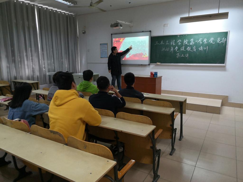 11月9日,土木工程学院第一学生党支部于5425教室召开2020年党员教育培训第一讲:“不忘入党初心,坚定梦想信念”主题教育。第一学生党支部全体成员参与此次会议。