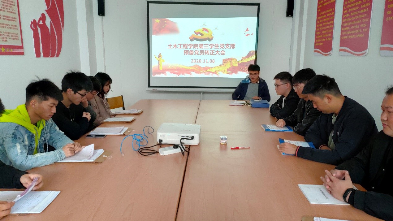 按照中国共产党党章的相关规定,11月8日,土木工程学院第三学生党支部于5号教学楼党员活动室开展预备党员转正大会。第三学生党支部书记陈哲主持本次会议,第三学生党支部全体党员参加本次活动。