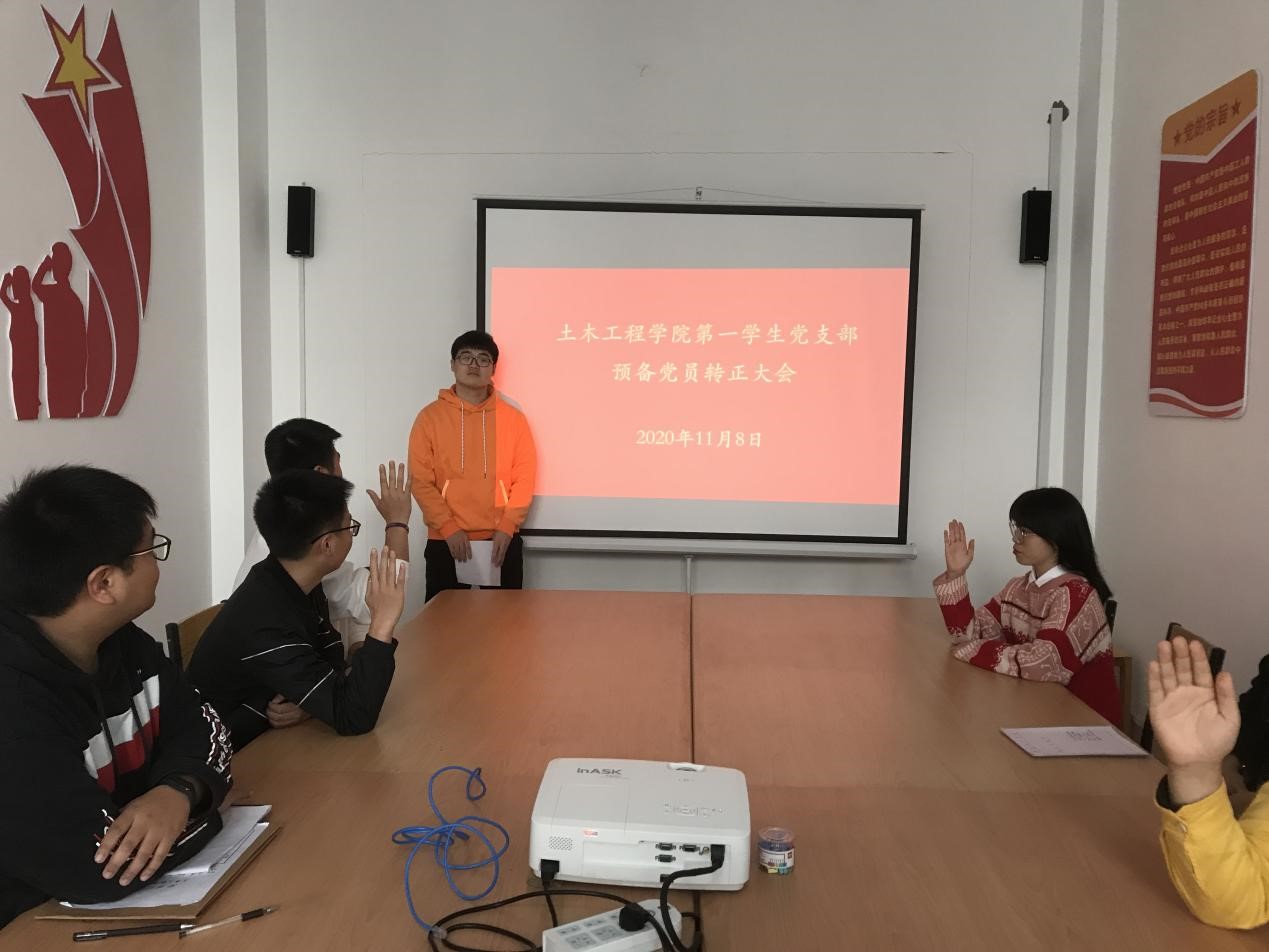 此次会议主要讨论了姜依、赵绍锴、赵博三位预备党员的转正事项。会议开始,申请人逐个上台宣读转正申请书,分别从思想、学习及生活方面讲述自身在预备期中的表现,表明自己入党的决心。随后支部大会充分讨论,认为这三位预备党员思想端正,学习上进,具备了成为正式党员的条件。