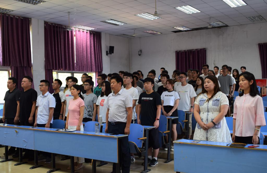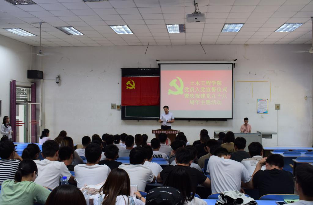 (宣传部 图/王天俊 文/王天俊)6月13日下午3时,土木工程学院预备党员入党宣誓仪式暨庆祝建党九十八周年主题活动于五阶一多媒体教室庄严举行,出席本次仪式的是土木工程学院党委书记杨庆年老师、党委副书记任朝斌老师、团学工作办公室主任冯博老师、各年级辅导员,我院全体学生党员和2019年6月新发展的20名预备党员积极参与了本次活动。
