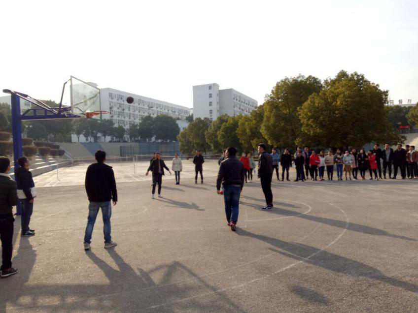 随着裁判一声哨响,篮球联谊会正式开始。场上的同学都拿出了十二分的精神,“来来来,传给我,小心躲过他,投篮进球,太棒了”场上不时传来同学们的声音,球随着声音在各个同学手中传递,奔向最终的目的地—篮筐。此时一个身影出现,运球三步上篮一气呵成,赢得了场上一片欢呼。场下的拉拉队也使劲儿的为自己的队伍加油助威。