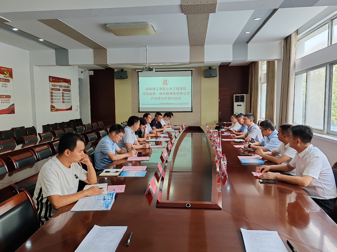 2024年9月5日,我院与河南省第一地质勘查院有限公司在土木工程学院二楼会议室举行了产学研合作签约揭牌仪式。河南省第一地质勘查院有限公司党委委员、副总经理、工会主席黄璞,校地合作处副处长杨怀坦,土木工程学院院长陈孝珍、党委书记田进军、副院长赵权等参加了签约仪式。