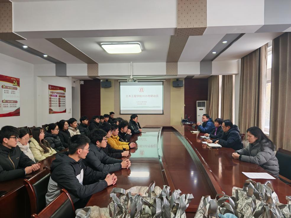 为帮助考研学子坚定考试信念,增强考研信心,缓解备考压力,12月19日,土木工程学院在学院会议室召开2025届毕业生考研慰问暨考前动员大会。学院院长陈孝珍、党委书记田进军、党委副书记冯博和毕业班辅导员共同为考研学子发放“考研大礼包”,送上真诚祝福和温馨鼓励。