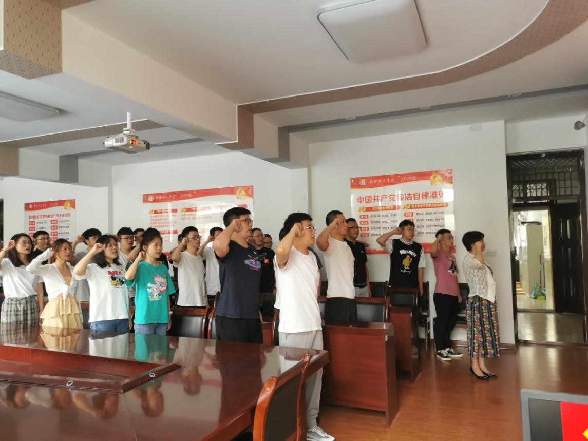 大会在庄严肃穆的《国际歌》中拉开序幕。学院党委副书记冯博同志宣读了2021年6月新发展的44名预备党员名单。在学院院长陈孝珍同志的领誓下,新发展的44名预备党员和老党员一起,面向鲜红的党旗,庄严地举起右手,以铮铮的誓言,向党宣誓。