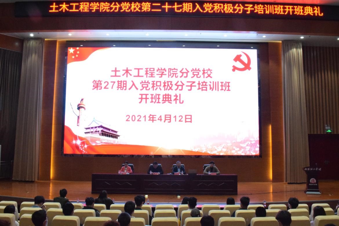4月12日,土木工程学院分党校第27期入党积极分子培训班开班典礼在学校第三报告厅举行。学院党委委员、师生党员代表和入党积极分子参加典礼,党委副书记冯博同志主持。