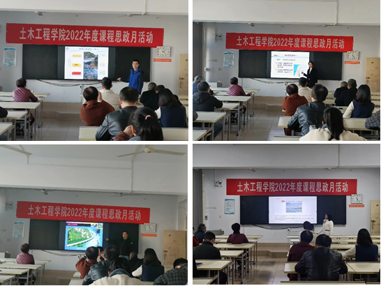 在示范课活动中,各位主讲教师结合自身课程思政改革中的优秀案例,为大家展示了一堂堂生动的课程思政教学实践。曹文豪老师从基坑边坡失稳发生安全事故出发,引入土的抗剪强度概念和莫尔-库伦准则,引导学生用理论指导实践,增强专业责任感。刘玉老师从水危机事件出发,引入水资源的基本概念和特性,引导学生具有节水意识,保护水资源,防止水污染,促进人水和谐发展。李岩老师结合京港澳高速粤境北段安全事故等案例讲解道路纵断面设计方法,引导学生在设计时反复核查,精益求精,避免因道路设计不合理引起的安全问题。谢玉辉老师在绪论中引入我国南水北调等超级工程中大型水泵的应用案例,引导学生树立专业自信,文化自信。
