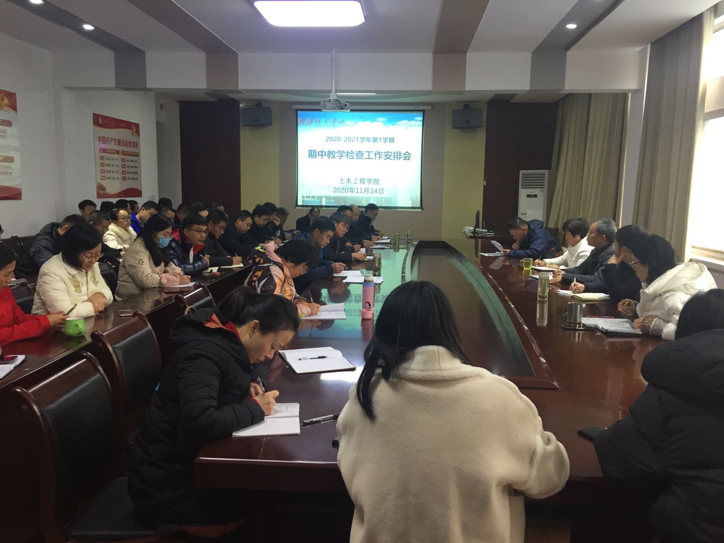 11月24日下午,土木工程学院召开2020-2021学年第1学期期中教学检查工作安排会,会议由院长陈孝珍教授主持,副院长马中军教授做主要业务安排,全体教师参加。