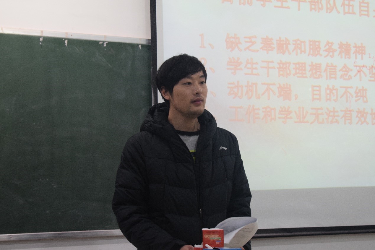 张子正老师在本次活动中主要讲述了如何做一名优秀的学生干部。讲话主要内容分为三点,一是高校学生干部的定义和特点,二是目前学生干部队伍自身存在的问题,三是学生会干部应具备的素质。高校学生干部是高校学生中的骨干,是帮助学校做好学生工作的中坚力量,是有效展开学生思想教育和行为管理工作的得力助手。揭示目前学生干部队伍存在一些问题,缺乏奉献和服务精神、理想信念不坚定等。最后讲到学生会干部要真正成为学生中的“精英代表”,要成为学生的领袖和老师的得力助手,架起老师和学生之间的桥梁,造就全面的工作局面。