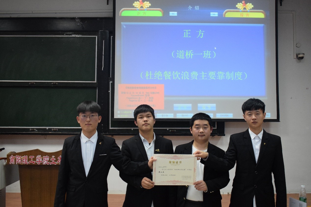 本次辩论赛围绕“杜绝餐饮浪费主要靠道德还是制度”展开激烈辩论。继双方自我介绍后,比赛进入开篇立论环节。正方20道桥一班以“制度上更加有效,快速减少餐饮浪费”为核心论点,旁征博引,字字珠玑。反方20土木三班则从古今人们对于粮食态度的不同,现在与之前制度上的对比,和人们道德上对于浪费粮食的态度逐渐降低反驳正方观点。在自由辩论环节,双方更是针锋相对,一针见血,进行了激烈的交锋。辩手们良好的风范、出色的口才、敏捷的思维赢得了场下观众的阵阵掌声。最终反方20土木三班以三比二获胜。