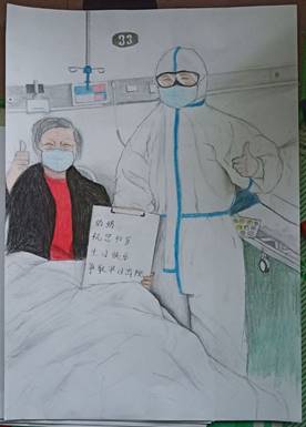 同学们用画笔描绘出心目中的白衣天使形象,以此来表达对她们的崇敬和祝福。本次活动共选出一等奖两名,二等奖四名,三等奖八名。其中,19级田瑞云同学荣获一等奖,她的作品中,身着医护服的护士为在病床上的老奶奶庆祝生日,两人眼中满含笑意,共同竖起大拇指来互相鼓励;19级雷焕婷同学获得二等奖,她的作品中,钟老先生消瘦的面孔,坚定的双眸,花白的头发,无一不饱含着他对此次战疫必胜的决心。