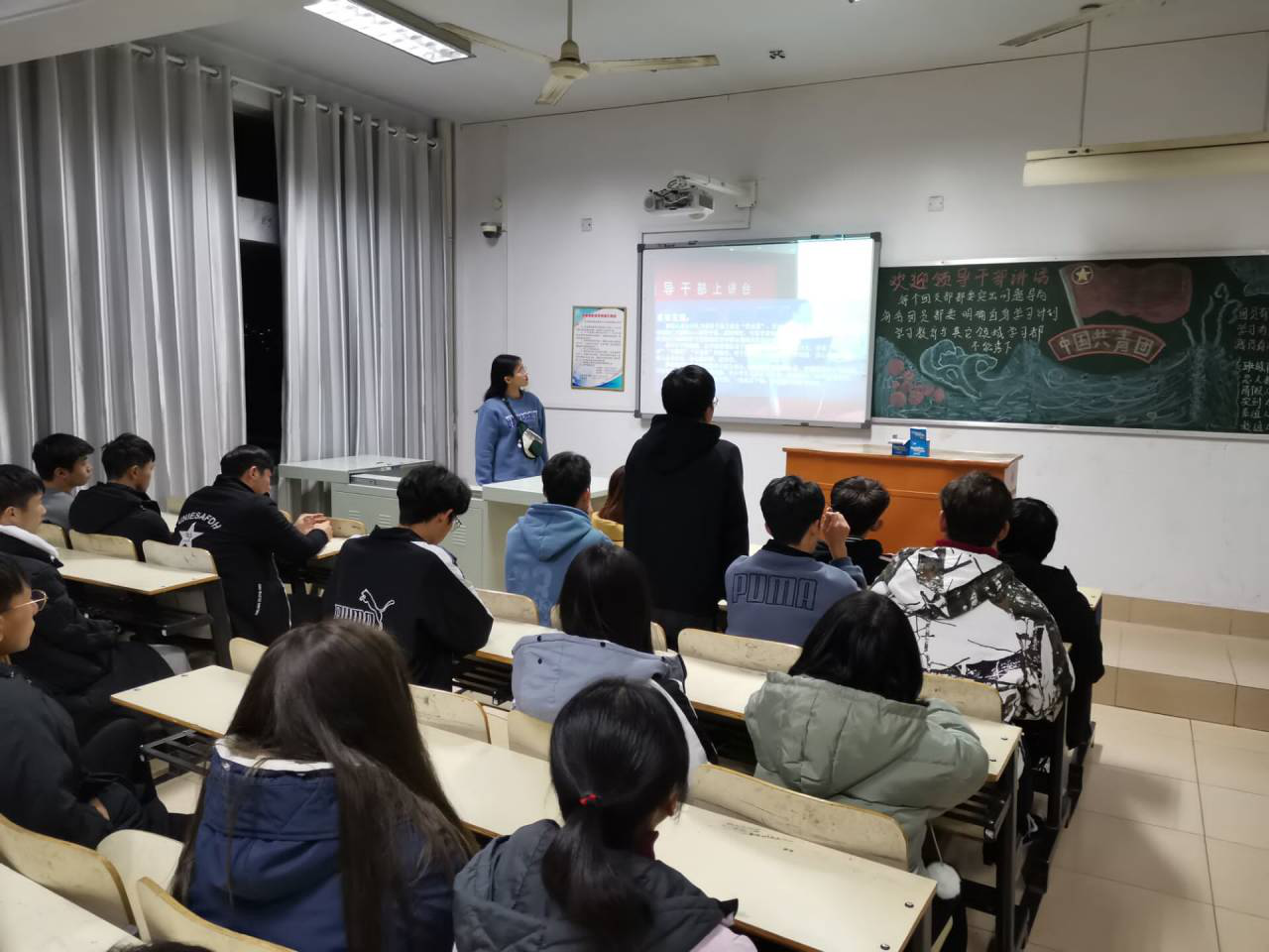 (宣传部 图/李业群 文/李业群)为深入贯彻习近平新时代中国特色社会主义思想,丰富大学生思想政治教育的形式和内容,12月1日晚七时许,我院于19级各班自习室开展“领导干部上讲台”主题班会,19级全体同学参加。