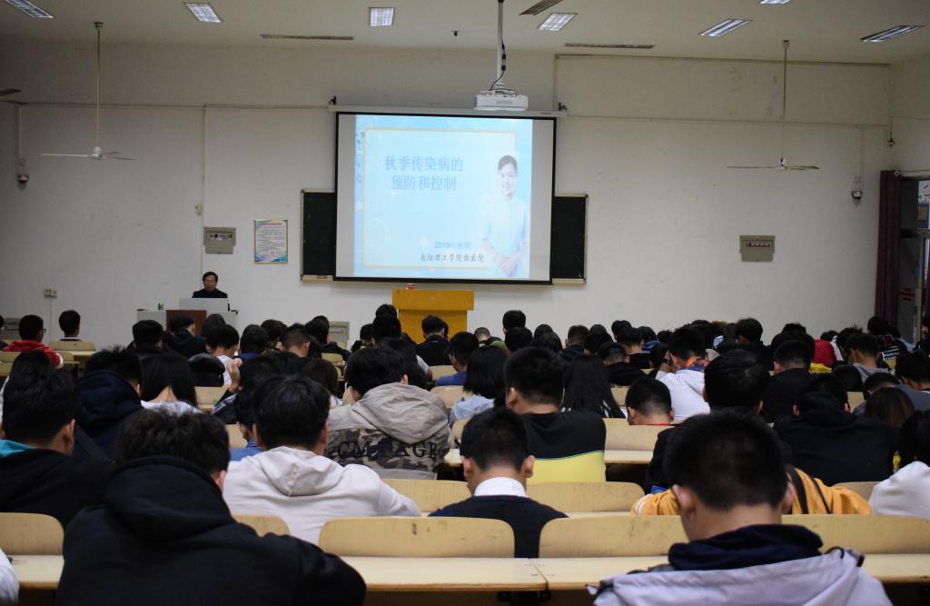 (第二课堂运营中心 文/曹祺昕 图/李明坤)10月19日晚,我院在7101教室举办秋季传染病防控知识讲座,邀请南阳理工学院校医院庄海新医师主讲,近300名同学聆听讲座。