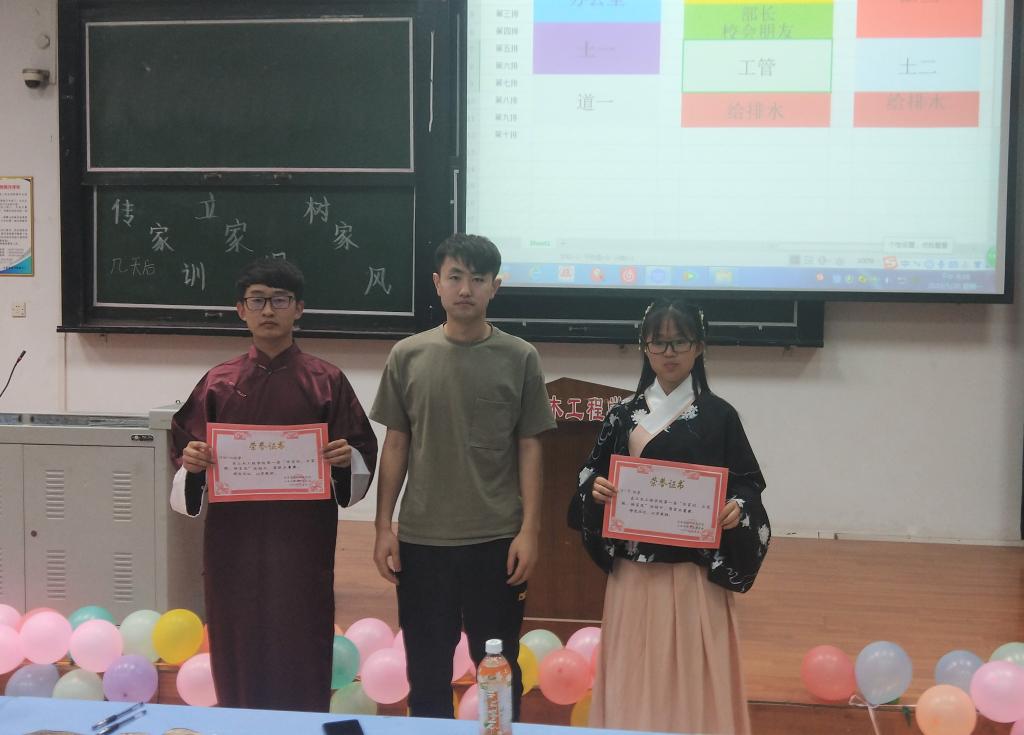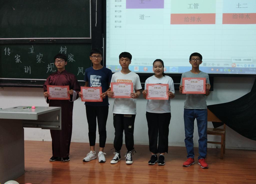 首先,主持人向土木工程学院第一届“传家训,立家规、扬家风”征文比赛中优秀同学发放证书,然后在主持人进行了简短的介绍后,同学们以热烈掌声请出了第一组选手的《异域风采》,通过介绍来自新疆的家风,让同学们对于新疆有了更为深入的认识;随后第二组选手选手为同学们带来了《法官的家风》,并以小品的形式向同学们展示了一种廉洁、公正的家风。紧接着第三组选手用一曲改编自《成都》的《南阳》向同学们展示了南阳风光。第四组选手的《家的风向标》,用PPT向同学们介绍了河南的家风。第五组选手以《客家讲堂》和舞蹈来表现客家人的家风。紧接着第六组选手又为同学们带来了《家风传万代》,以相声的形式来展示了节俭的家风。经过舞台下评委们公平、公正的评审,最终作品第三组作品《南阳》夺得一等奖,第五组作品《客家讲堂》以及第六组作品《家风传万代》荣获二等奖,第一组作品《异域风采》、第二组作品《法官的家风》以及第四组作品《家的风向标》取得了三等奖。