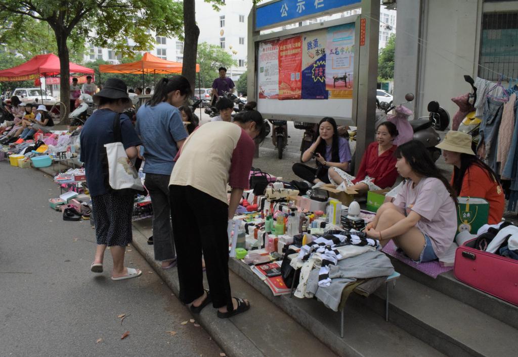 道路两旁摆摊的大多是临近毕业的学长学姐,他们以优惠的价格将自己的学习和生活用品卖给低年级同学。其出售的商品有书籍、运动器材、小书桌、衣服及各类小物件,让人目不暇接。活动开始不久后,已有不少同学甚至一些校外人员加入了选购商品的行列,现场人山人海,热闹非凡。