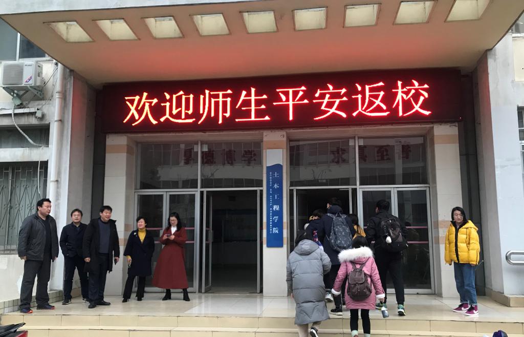 25日早七时四十分,由我院党委书记杨庆年老师和院长陈孝珍老师带领学院领导班子,在教学楼门前欢迎同学们返校上课,在早春寒冷的清晨为同学们送上温暖。
