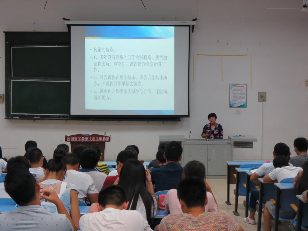 段老师从消防、交通、校园治安、日常生活知识、女生宿舍安全防范和国家安全六大方面为同学们做了详细讲解。其中在消防安全上,段老师强调严禁在宿舍使用大功率电器,如吹风机、热水器等,严禁在寝室内私拉电线给电动车充电,以免造成电路失火,并举出多所高校出现火灾的案例,引起同学们的重视。同时提醒同学们自觉抵制不良网络贷款,增强辨别网络、电信等虚假信息诈骗的能力,远离传销据点等。最后,段老师表示,希望同学们能够舒服、安全、圆满地度过自己的大学生活。