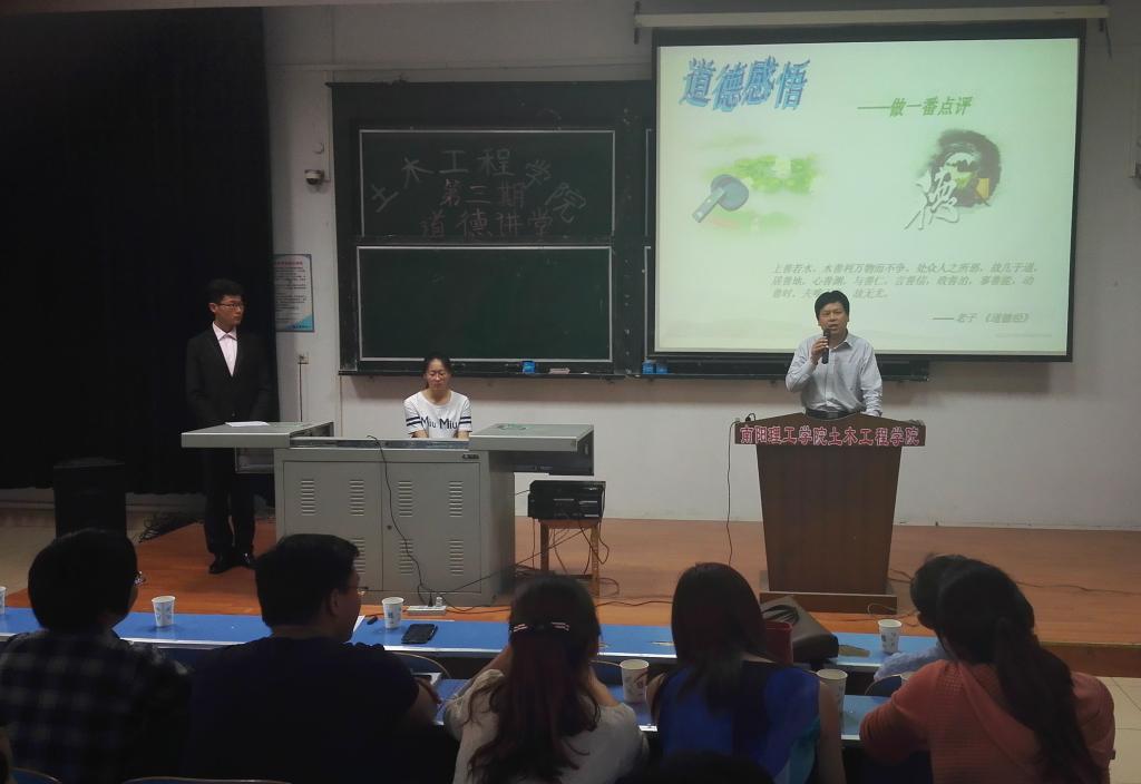 (新闻中心记者:徐博 龚洪苇 崔钰 报道)为加强全院同学的思想道德建设工作,努力提高同学们的思想道德水平和个人文明素质。5月12日,由我院学习部主办的道德讲堂在五阶二成功举办,出席本次活动的有我院党总支书记赵彦普、院长司马玉州、副院长杨庆年、土木工程学院全体教师以及14级部分学生代表。