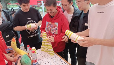 此次活动设置了搭纸杯及投乒乓球抽题等有奖竞答活动,充分发挥了学生们的动手动脑能力。在搭纸杯活动中,学生们要想办法将手中的纸杯搭成一个三角形。尽管过程比较困难,但当同学们成功搭起纸杯时,大家脸上无不洋溢着成功的喜悦。