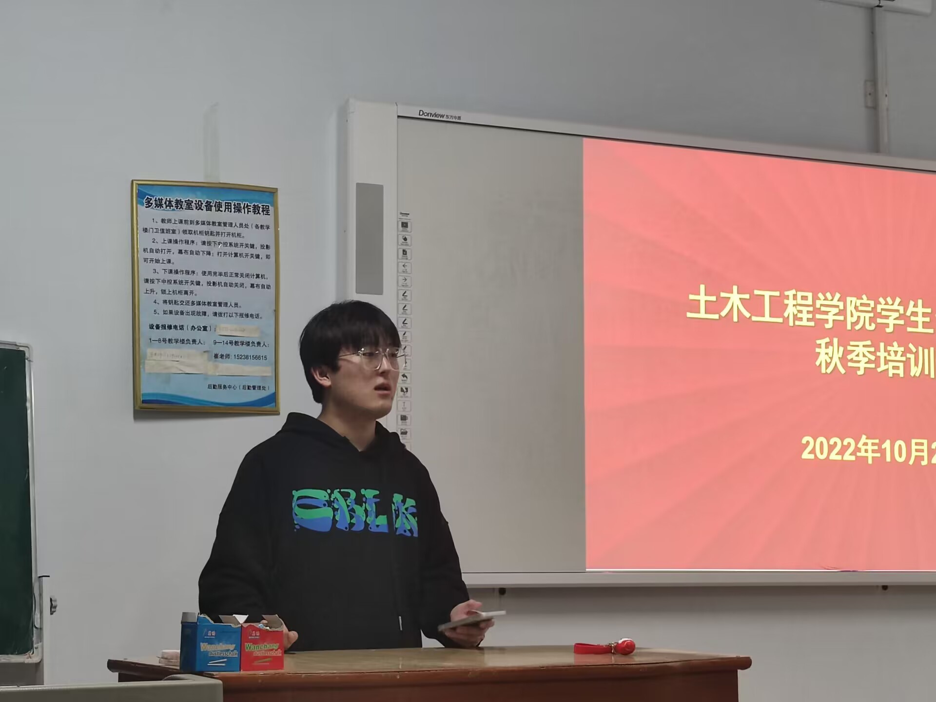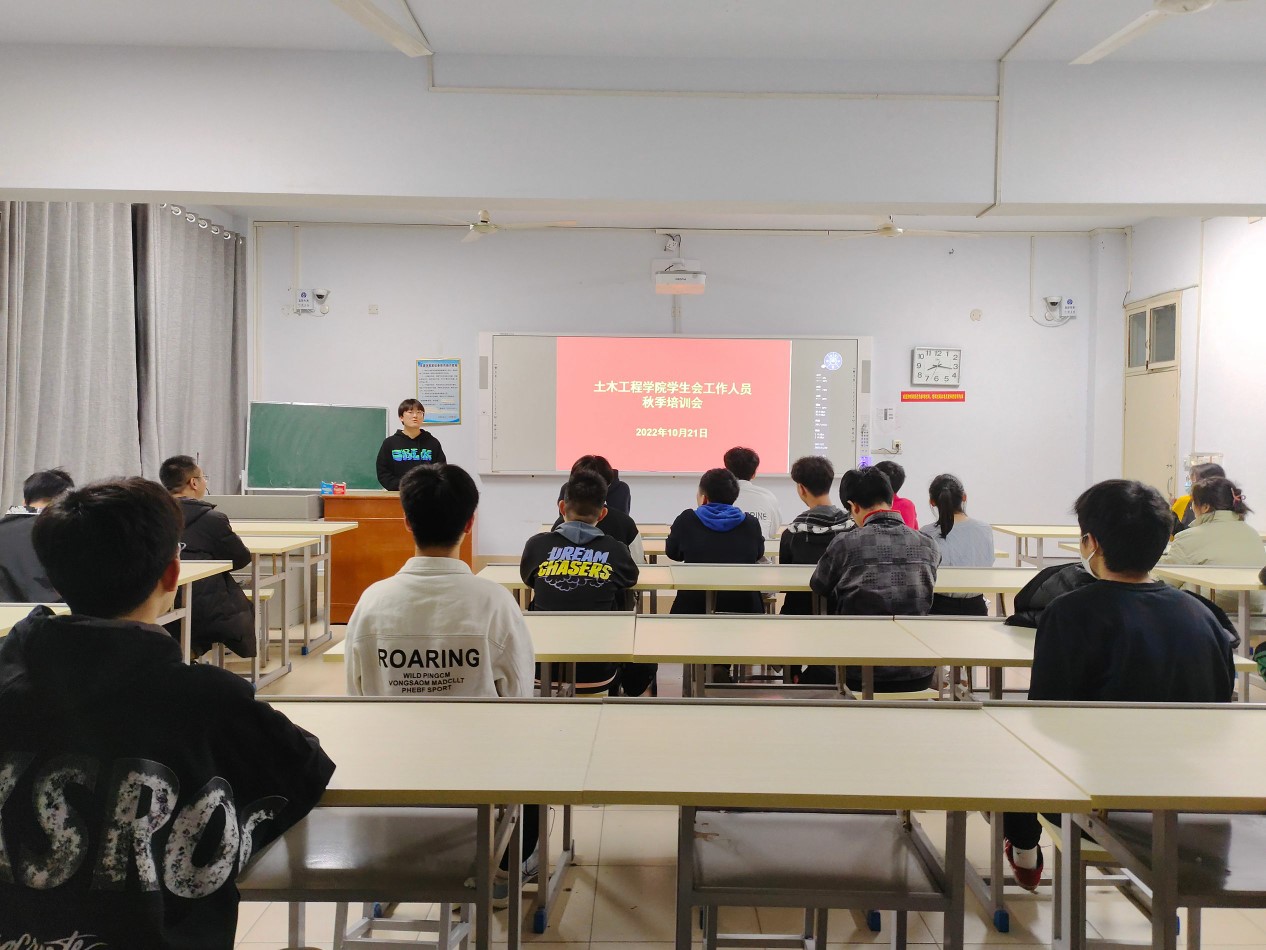 为加强我院新一届学生会的服务意识,持续巩固我院学生会组织深化改革成果,土木工程学院第二十六届学生会于2022年10月21日19点在五号教学楼509教室举行学生会工作人员秋季培训会,由学生会主席韩驰为大家培训。