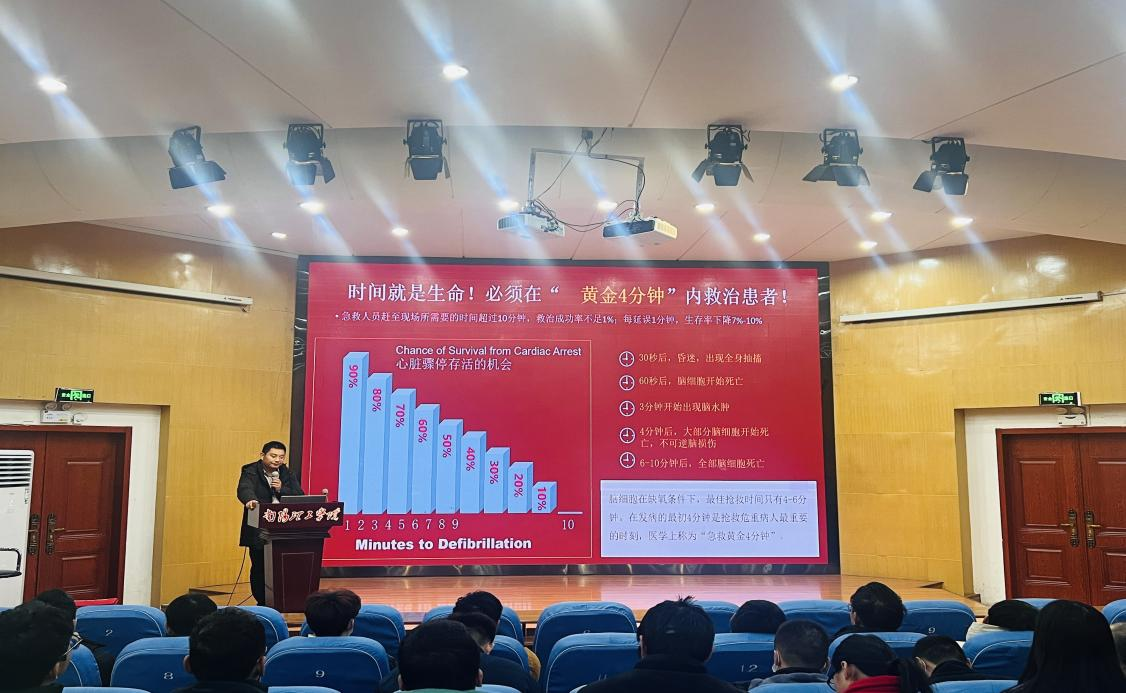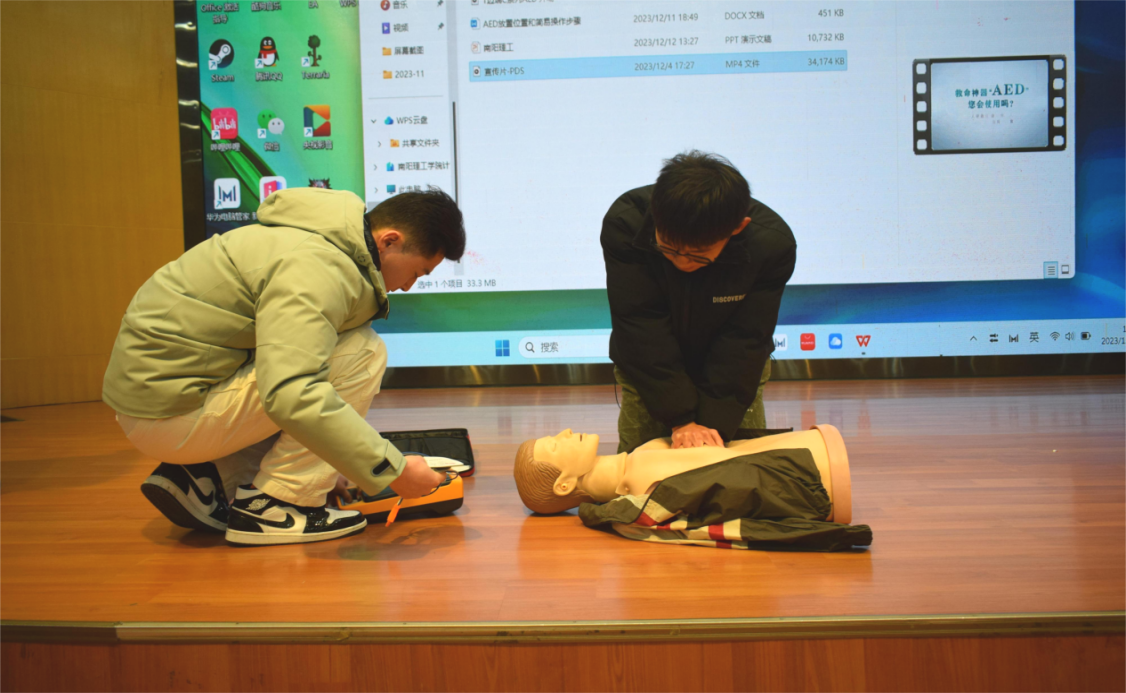 在培训过程中,主讲人细致讲解了关于急诊急救的基本概念和专业知识,教学了包括心肺复苏、创伤救护的止血包扎处理等基础急救方法,并向同学们科普了有关急救救人的相关法律条例。主讲人通过理论讲解结合实践,用模型现场示范教学,进行了心肺复苏等急救技能的展示,并手把手指导同学们进行了实操,使同学们对急救措施和“AED”的使用有了更加规范的了解。