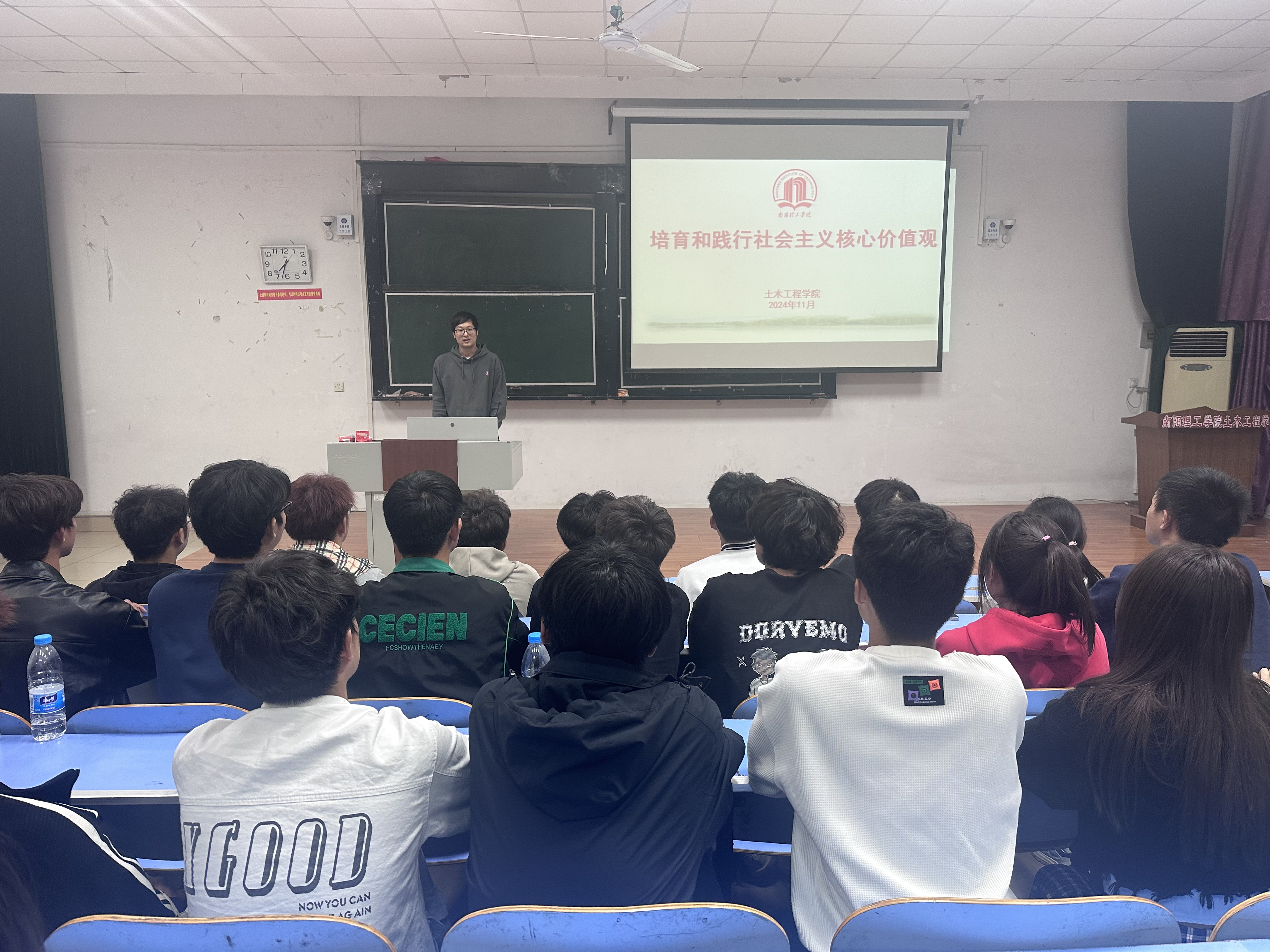 本网讯(特约记者/赵洪坤)为了引导学生深入理解社会主义核心价值观的深刻内涵,将其融入日常学习、工作和生活中,10月31日下午15:00,土木工程学院于5号教学楼五阶二教室举办“培育和践行社会主义核心价值观”讲座,张子正老师主讲,2024级新生参加。