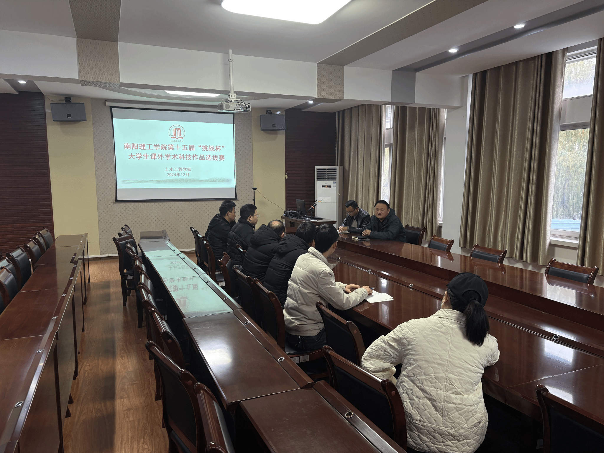 12月10日下午,土木工程学院在学院会议室举办第十五届“挑战杯”大学生课外学术科技作品选拔赛,学院党委副书记冯博和副院长宋建阳出席,各项目团队指导教师和学生负责人参加。