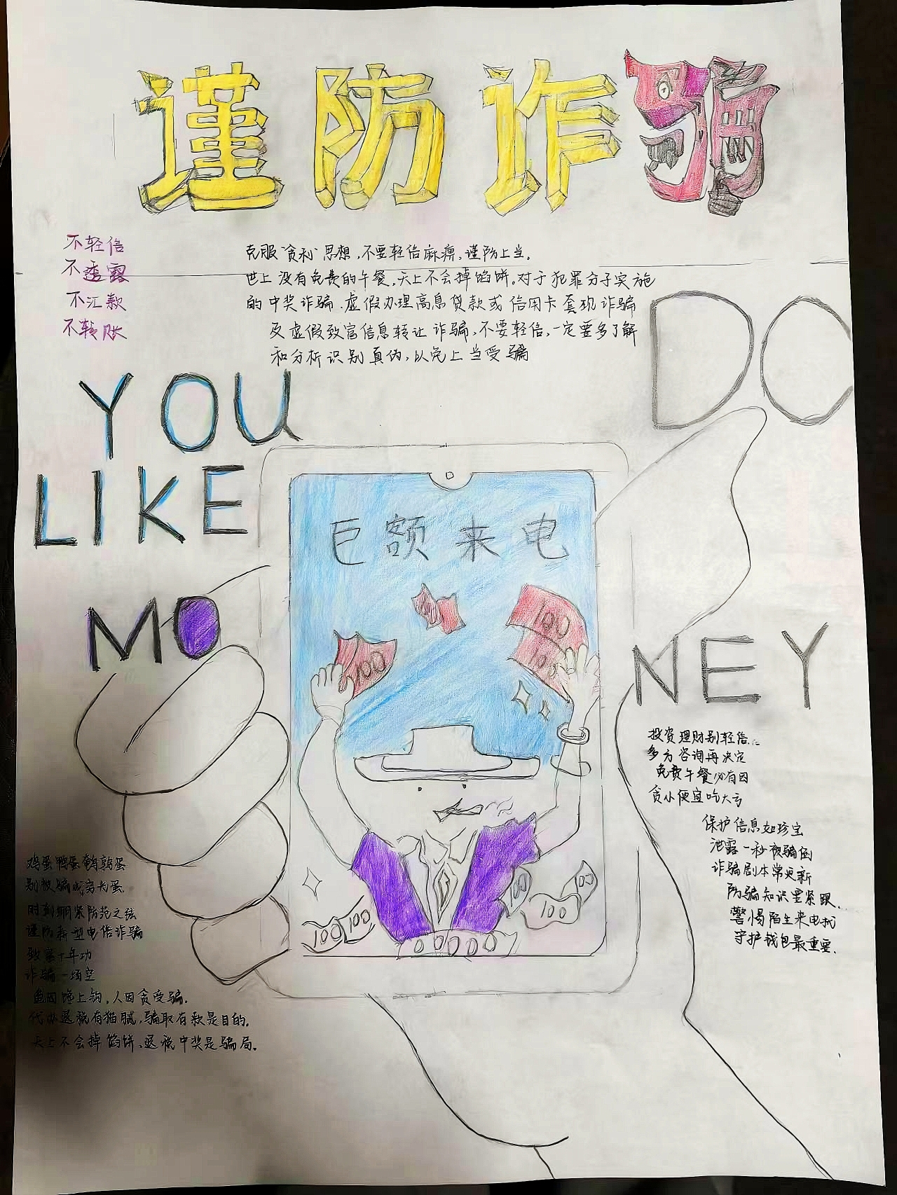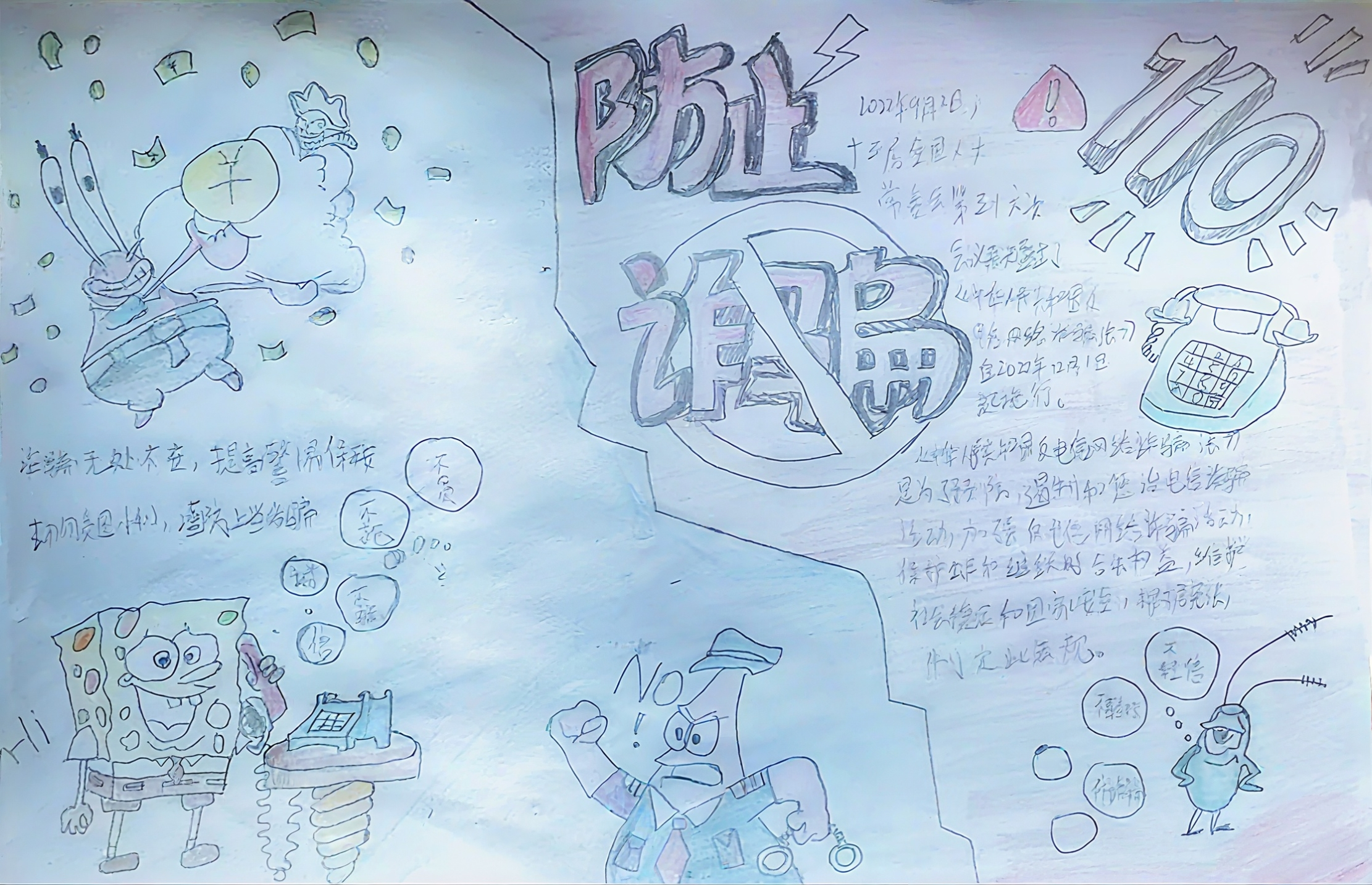 最后我院还开展了“防范电信诈骗”手抄报活动,大家纷纷发挥自己的创意和想象力,设计出一幅幅生动有趣、内容丰富的手抄报作品。这些作品不仅展示了学生们对反诈知识的深入理解和掌握程度,还传递了积极向上的正能量和防范诈骗的坚定信念。