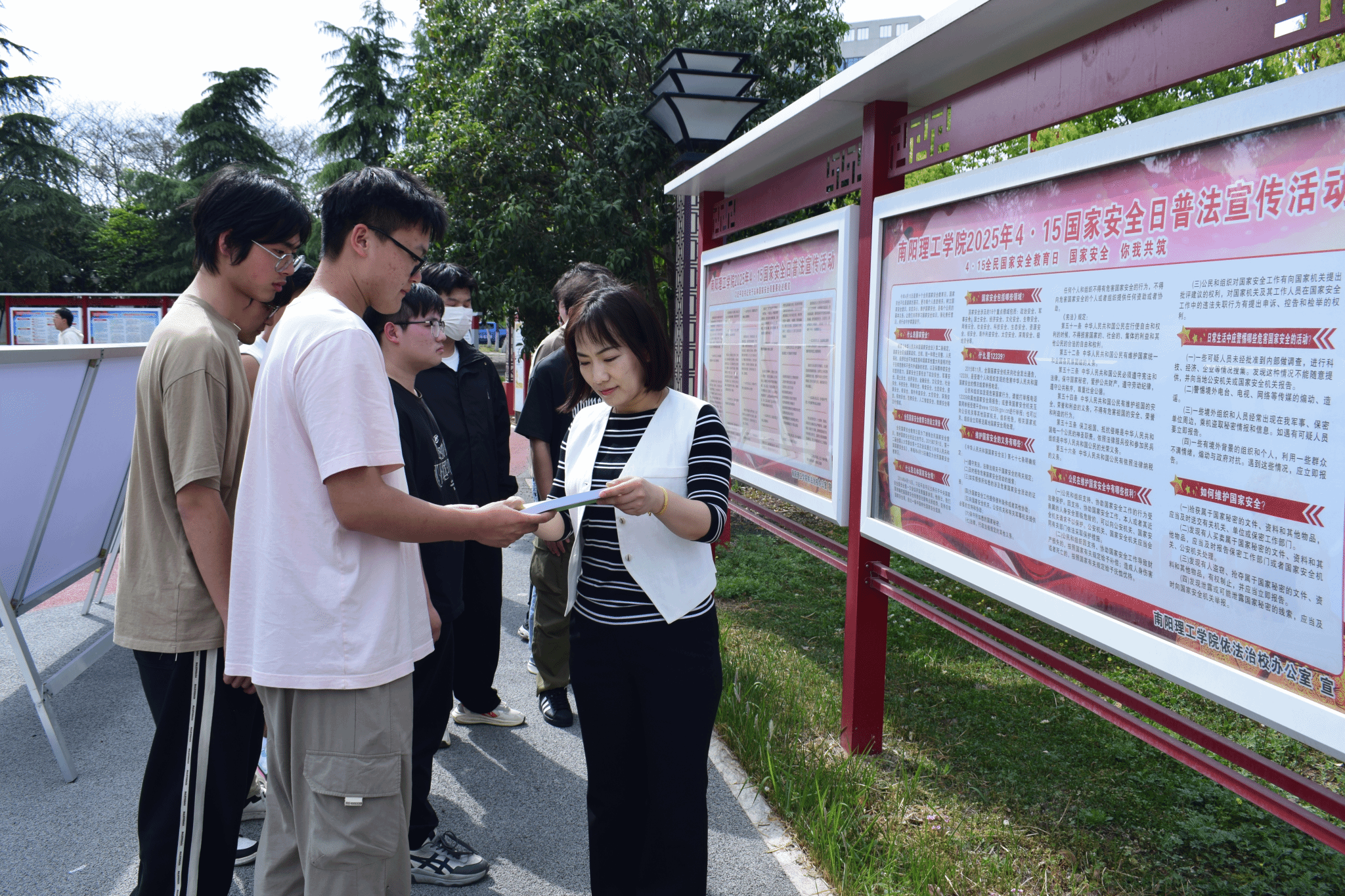 本网讯(特约记者/张子正)为深入贯彻落实总体国家安全观,增强师生国家安全意识,4月15日下午,土木工程学院在东南校区法治文化广场举办“4•15全民国家安全教育日”宣教活动,党委保卫工作部、依法治校办公室及各职能部门相关人员和师生代表参加活动,南阳市公安局示范区分局警官王春园等出席活动。
