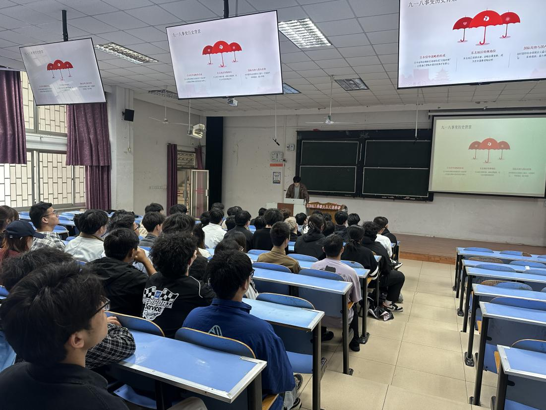 田进军首先带领全场师生回顾“九一八”事变历史,告诫同学们要牢记历史,努力学习,为实现中华民族伟大复兴贡献自己的力量。随后在上午十点,防空警报声在校园上空响起时,田进军带领全场师生在这一刻肃立默哀,缅怀在“九一八”事变中遇难的同胞和为抗战胜利做出巨大贡献的先烈们。现场气氛凝重,师生垂首肃立,深切缅怀历史,感悟民族尊严的珍贵。
