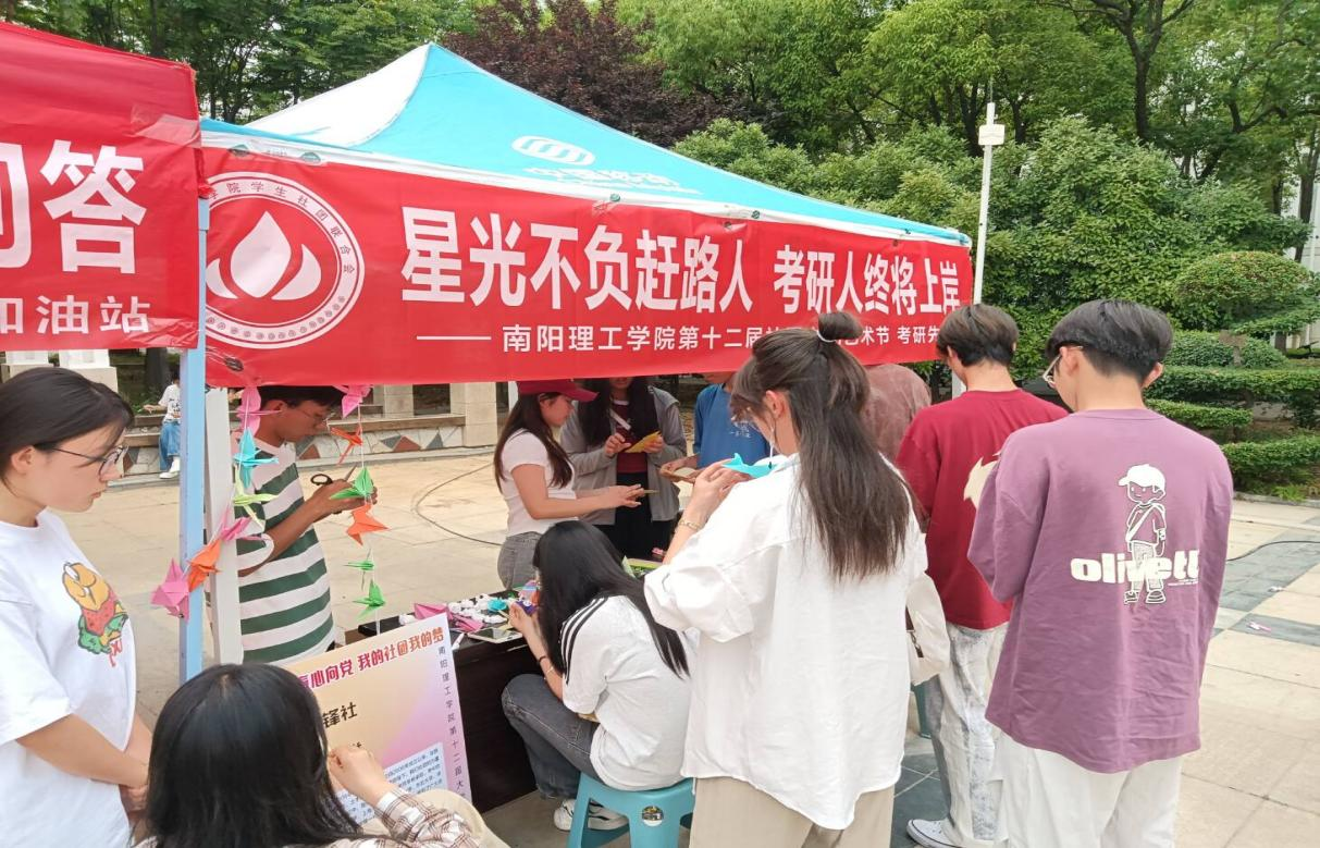 本网讯(特约记者/张向怡)近日,南阳理工学院第十二届大学生社团文化节盛大开幕,我院考研先锋社于6月1日至2日在齐贤广场面向全校师生举办“星光不负赶路人,考研人终将上岸”活动。本次活动旨在秉承“交流、分享、互助”的理念,搭建考研交流互助平台,助力南工学子志存高远。