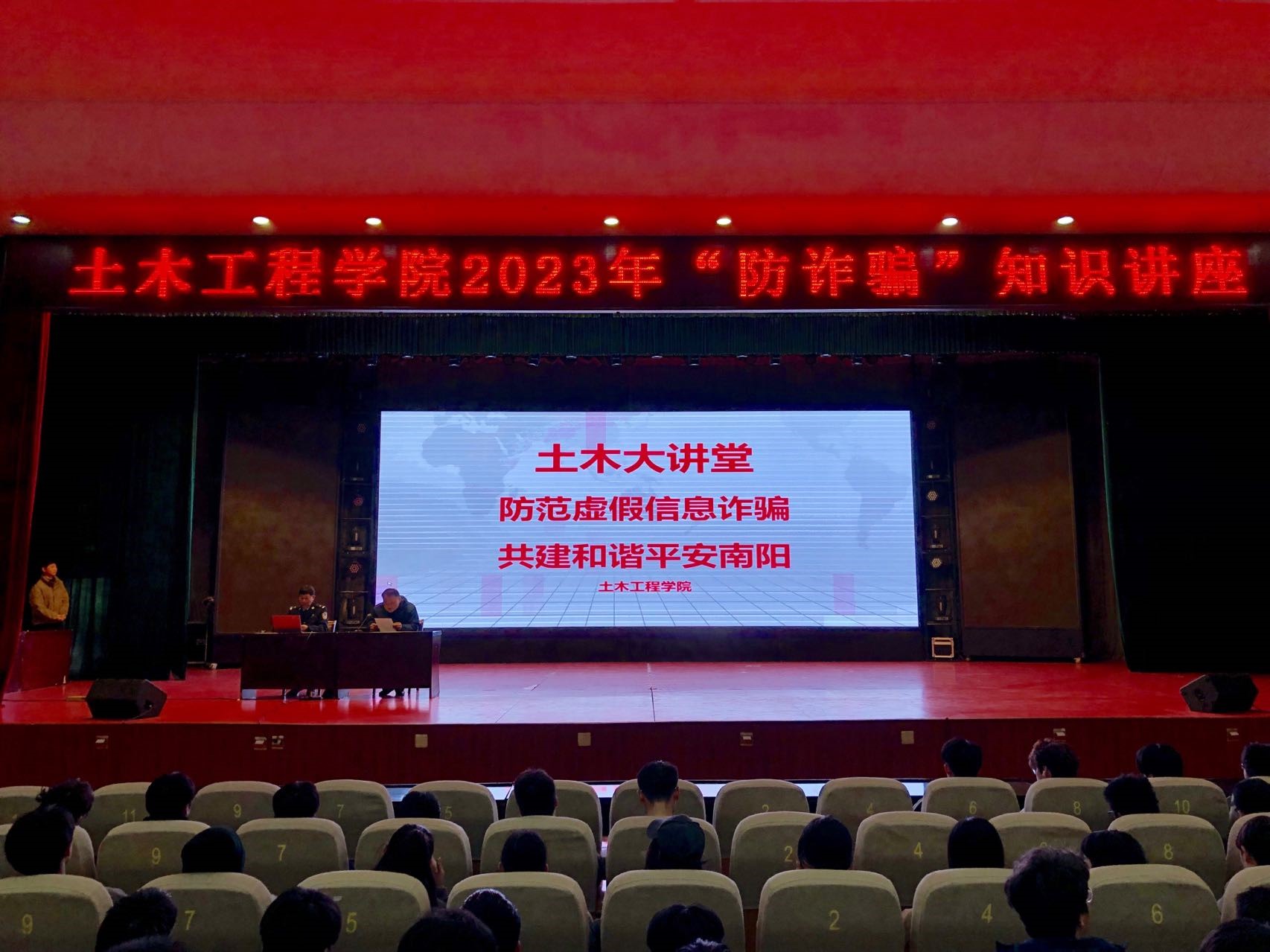 本网讯(特约记者/张子正)为有效防范电信网络诈骗,切实提升学生识骗防骗的意识和能力,预防和减少电信网络诈骗案件的发生。4月23日上午9:00,土木工程学院于毕业大厅举办土木大讲堂--“防范电信网络诈骗”主题讲座。本次讲座邀请南阳市城乡一体化示范区公安分局张志刚警官主讲,学院2021级和2022级全体学生参加了此次讲座。