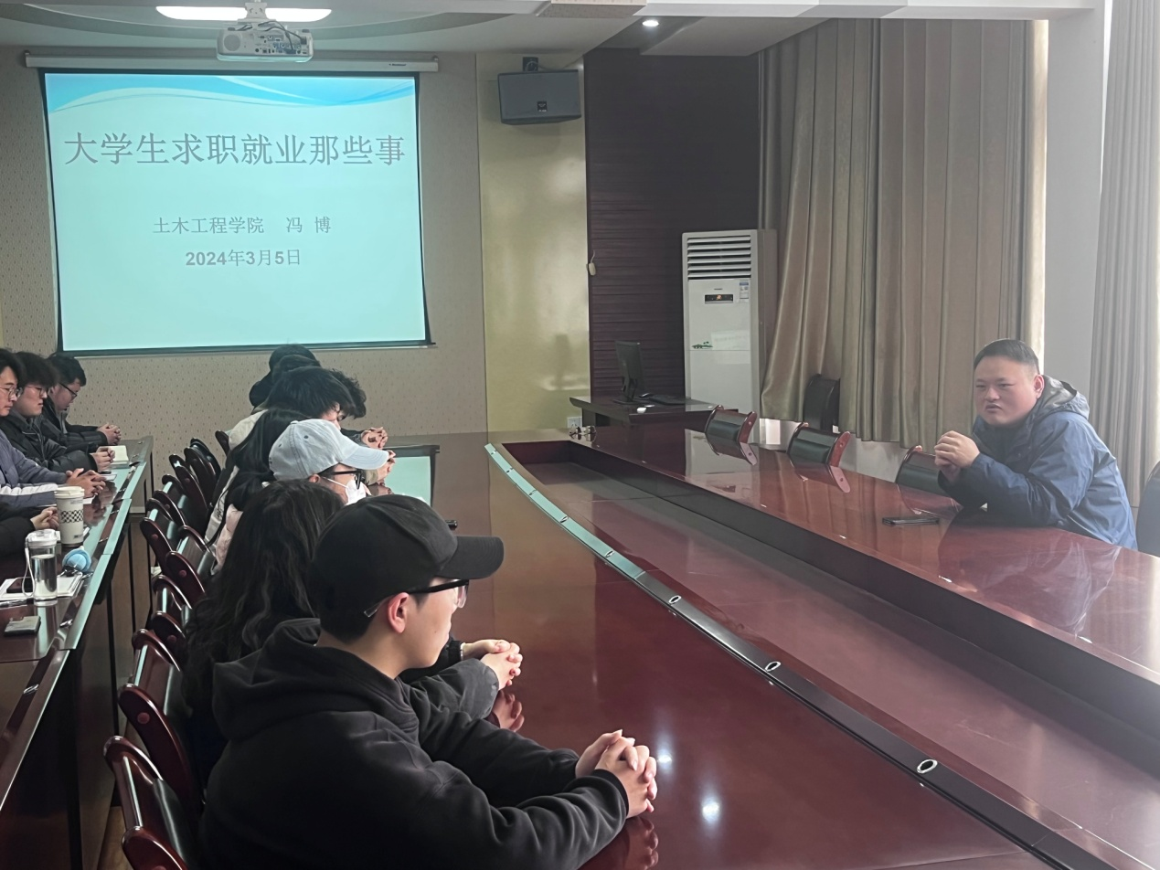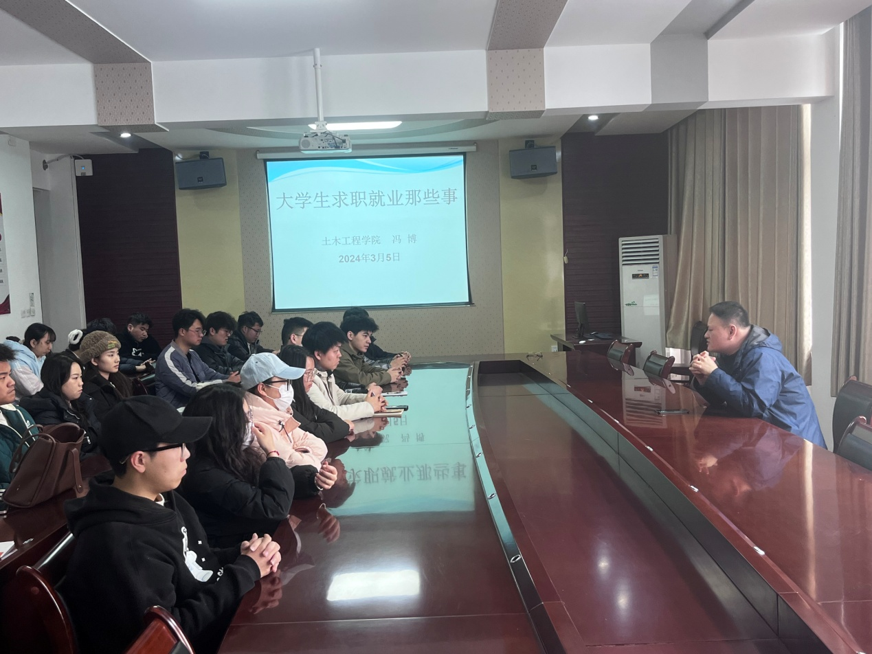 本网讯(特约记者/徐航)3月5日下午,土木工程学院在教学楼会议室举办“大学生求职就业那些事”为主题的土木大讲堂活动,学院党委副书记冯博老师主讲,2020级各班毕业生代表参加。