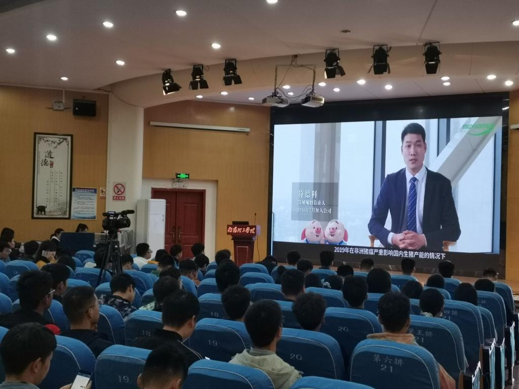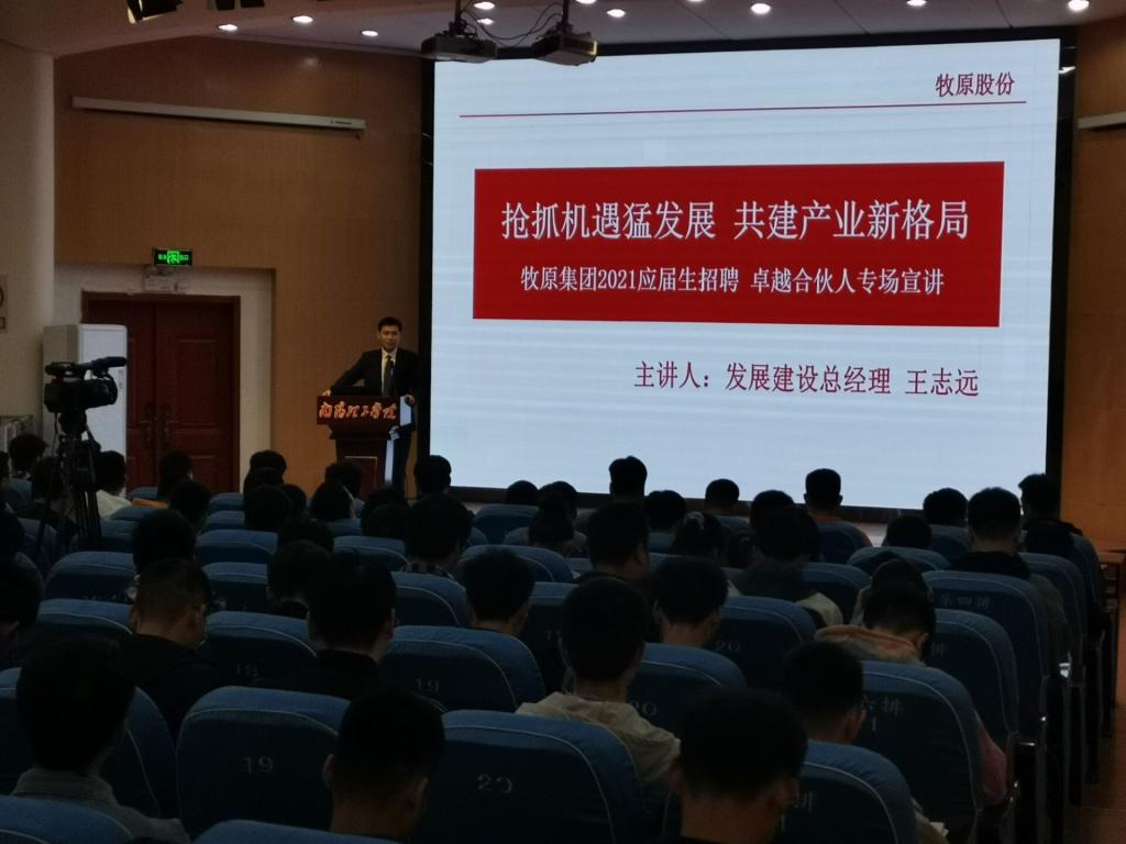 会议伊始,在第二报告厅的大荧幕上播放了牧原集团宣传片以及优秀校友的经验寄语。随后,王志远校友(现任牧原公司发展建设总经理)讲述了自己的就业经历和当前在公司的发展状态,同时也以自己的真实事例告诫同学们抓住机遇、正视现实、努力学习,发扬南工“厚德博学,求真至善”精神。他希望以自己来时的经验方法,成为同学们求职就业路上灯塔,为同学们指引方向。最后在互动环节,同学们提出就业方面的疑问都得到了满意的答复。