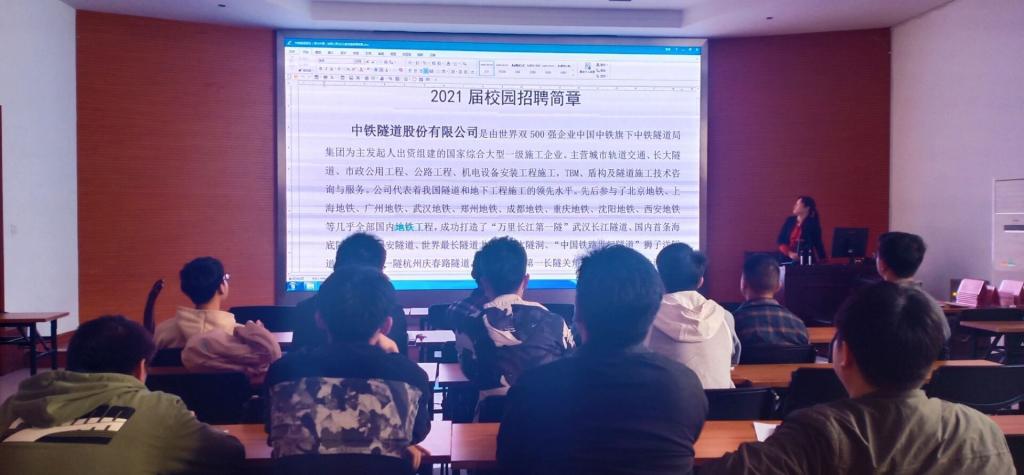 10月10日,中铁隧道股份有限公司于我校大学生就业服务中心多功能厅召开专场宣讲会,由邓女士担任主讲,部分应届毕业生参加。
