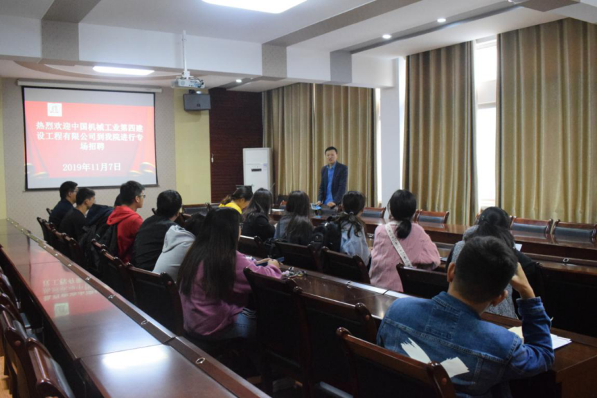(就业指导中心 文 刘 娟 图/夏雨露)为解决我院毕业生就业难问题,11月7日下午四点,中国机械工业第四建设有限公司在我院二楼会议室成功举办2020年度秋季宣讲招聘会,我院优秀毕业生参加此次会议。
