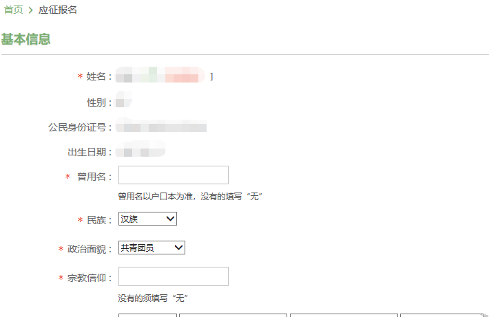 ③政治面貌:群众、中共党员、共青团员、其他党派成员,如实选定。(政治面貌一栏没有“预备党员”这个选项,如果是预备党员可先填写“中共党员”,后期咨询武装部看是否需要修改。)