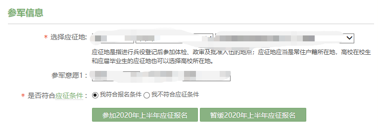 根据自己实际情况,选择应征地、参军意愿以及是否符合应征条件。